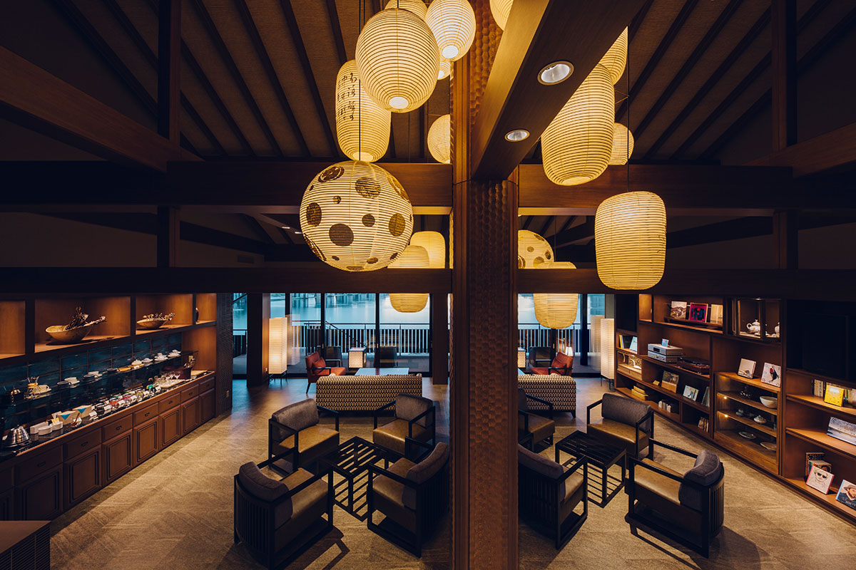 木曽川沿いを行き来する帆掛け船にとって灯台の役割をはたしていたことから命名された「灯屋 迎帆楼」。そうした由来を伝えるラウンジの照明に囲まれた大黒柱は、タモムク材のナグリ仕上げ。照明の明かりが、木肌の細かな陰影を映す。