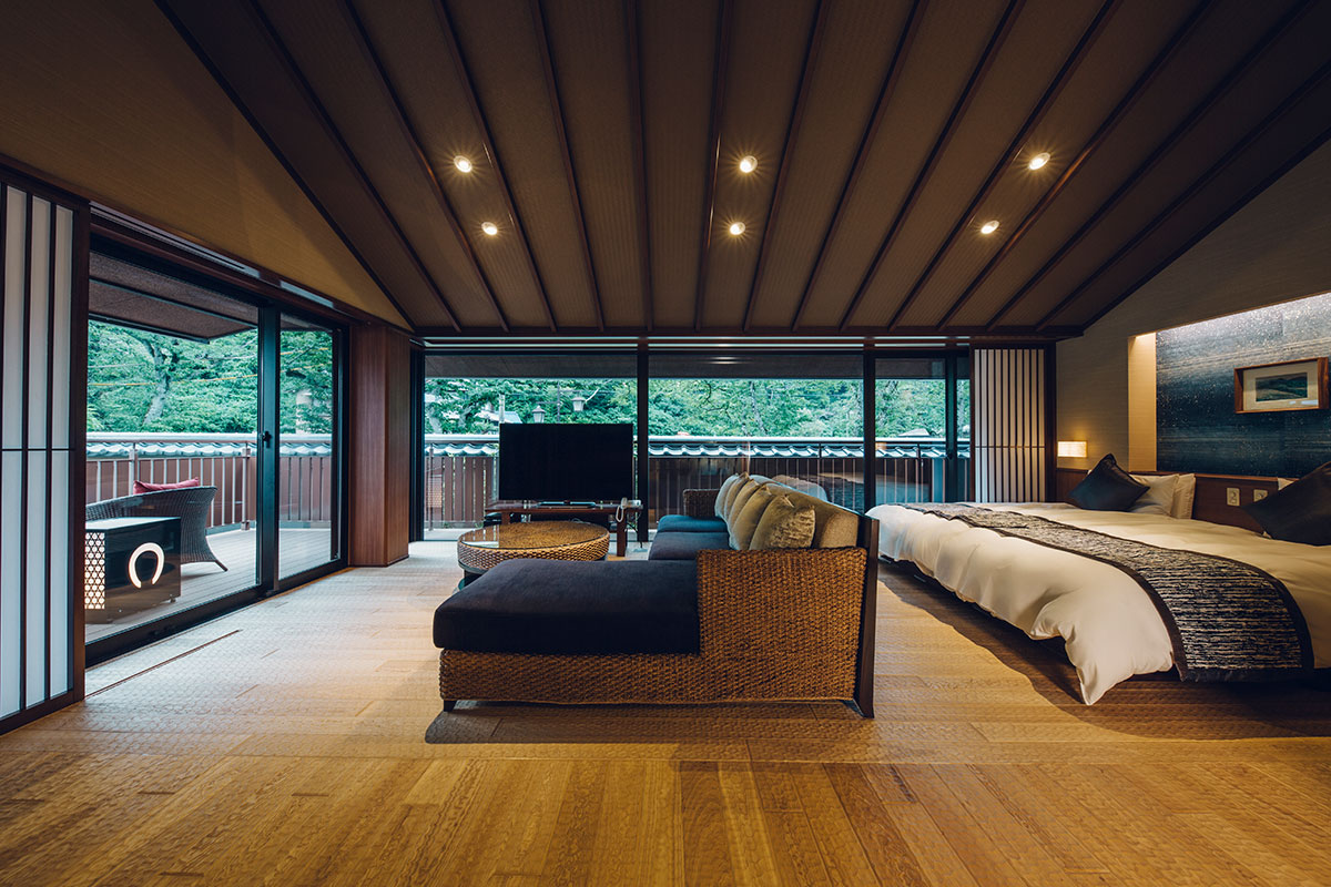 特別室は、平屋造りで竿縁天井のひろびろとした室内。床のフローリングはタモナグリ仕上げ。開放的な連窓障子を開ければ森に囲まれた犬山城を望むことができる。