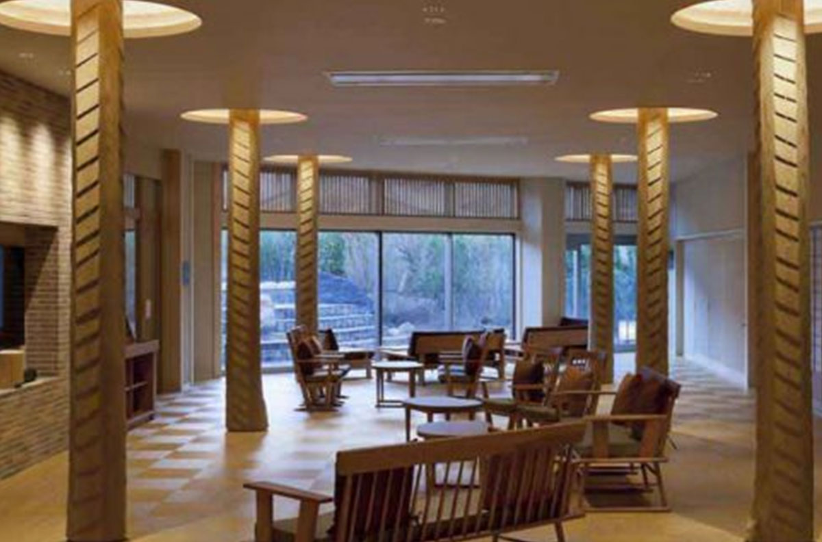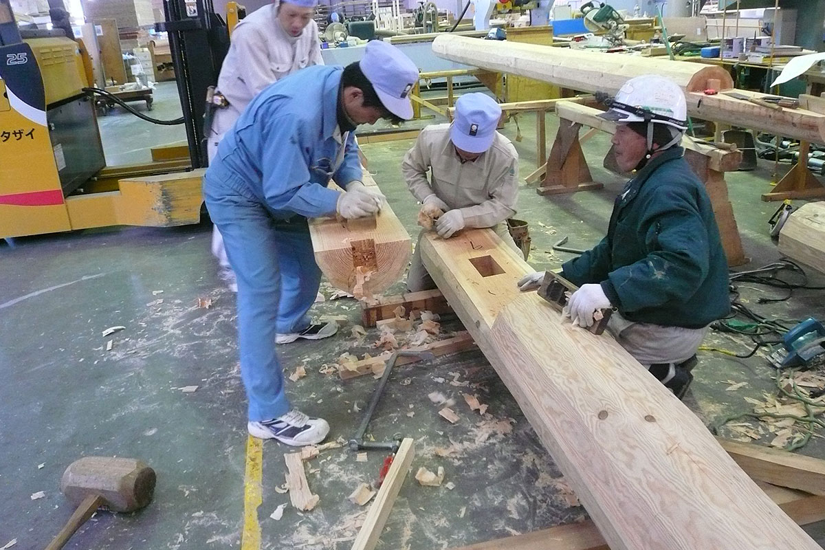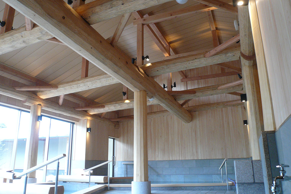 大浴場の小屋梁組に使用された杉の大径木は当社工場でなぐり加工。ホゾ組みされ、仮組みされたうえで、現場に搬入され、組み上げられた。